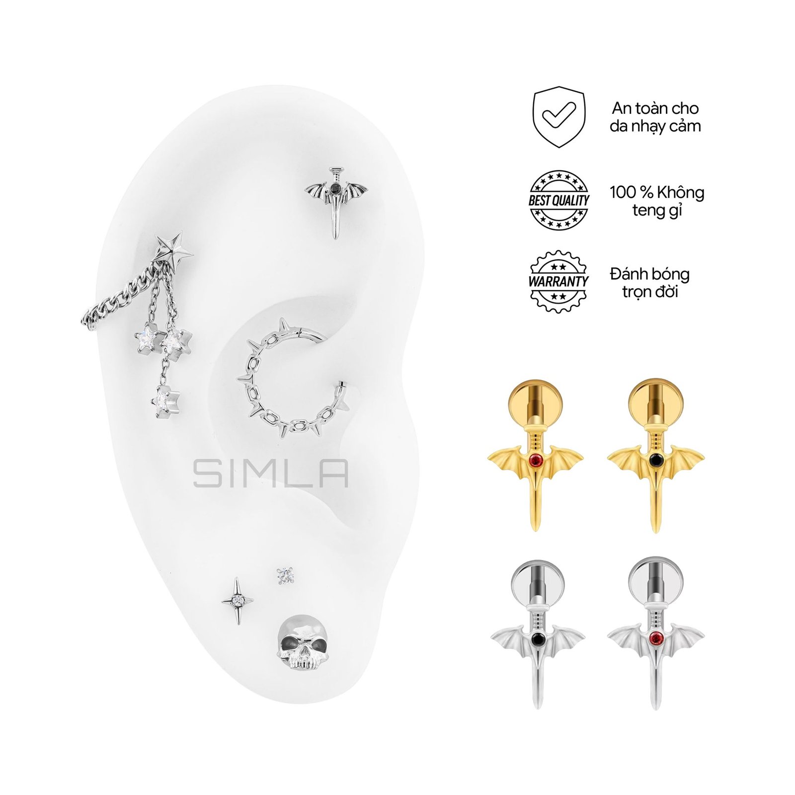 Phù hợp cho lỗ xỏ mới. An toàn cho da nhạy cảm. Bền màu, không teng gỉ.